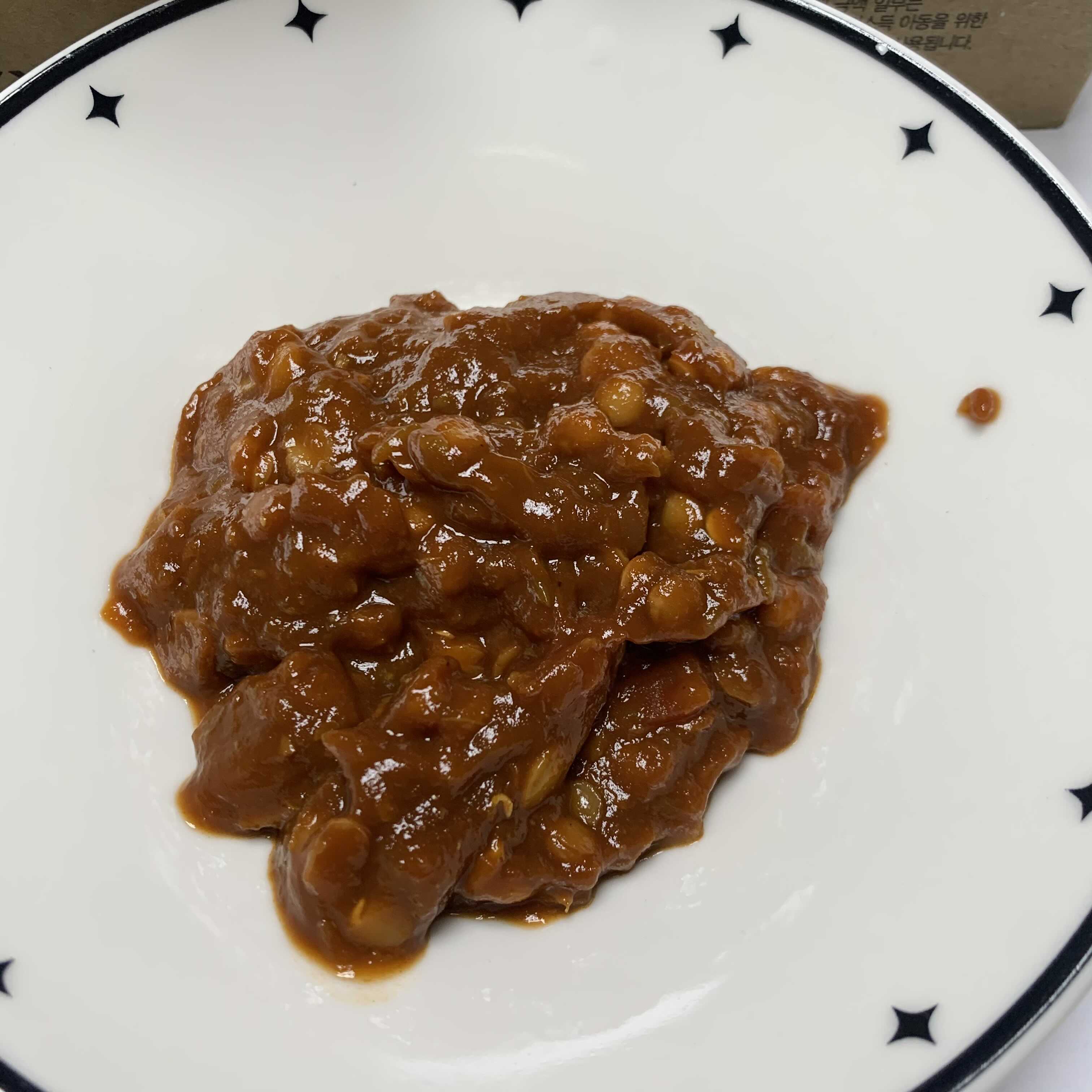 소스를 뜯어 따라보니 렌즈콩이 아주 실하게 들어있고 빨간 양념보다는 약간 된장 정도의 색감을 띄고 있어